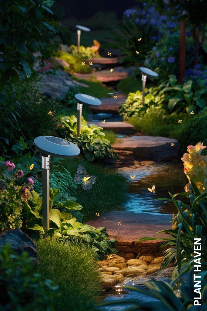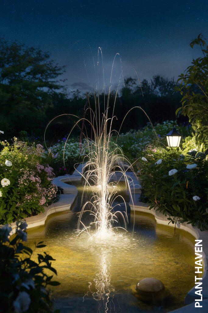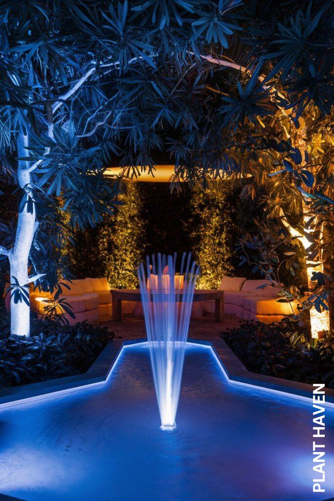 If you’ve got a pond, fountain, or even a tiny birdbath, light it up! Submersible lights or nearby spotlights can make water shimmer and dance.