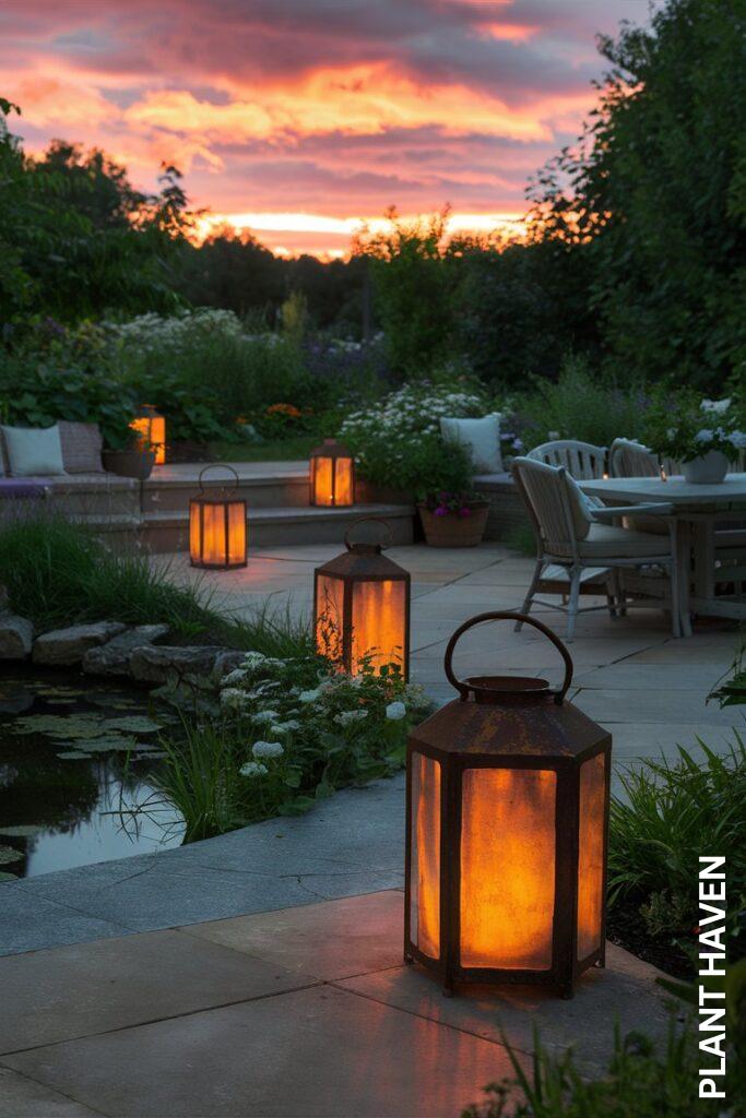Lanterns are like the accessory that goes with everything—classic, rustic, modern, you name it. Scatter them on your patio, hang them from trees, or line them up along a pathway. For one client, we went all-in with mismatched lanterns around their firepit—it was chef’s kiss.